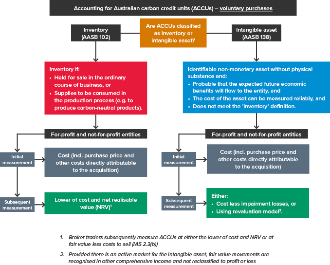 Consistent with the approach outlined above for producers, entities classify ACCUs voluntarily purchased as either inventory or intangible assets. The following diagram explains how voluntary purchasers initially and subsequently account for ACCUs.