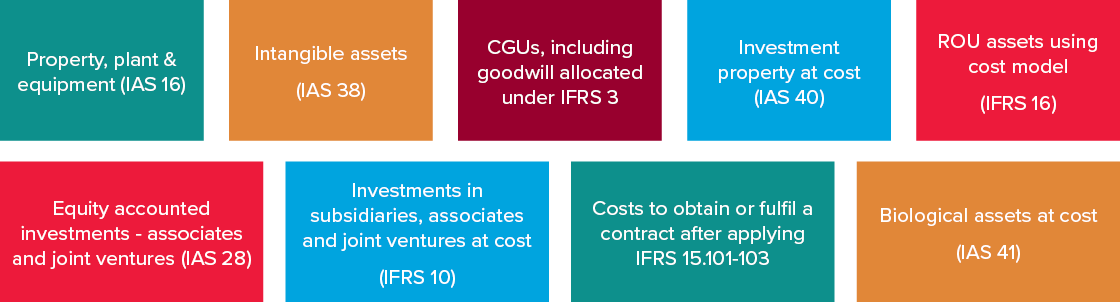 The following assets are excluded from the scope of IAS 36, with impairment requirements for these assets dealt with in specific Accounting Standards as shown below: