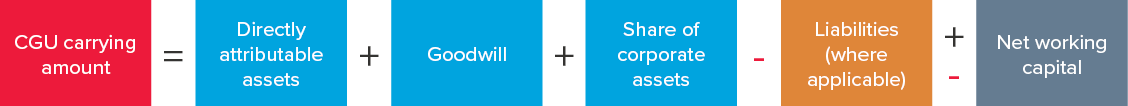 Determining the carrying amount for an individual asset is usually quite straightforward but is more complicated for a CGU, which includes a variety of individual assets (including goodwill). The carrying amount of a CGU is calculated as follows: