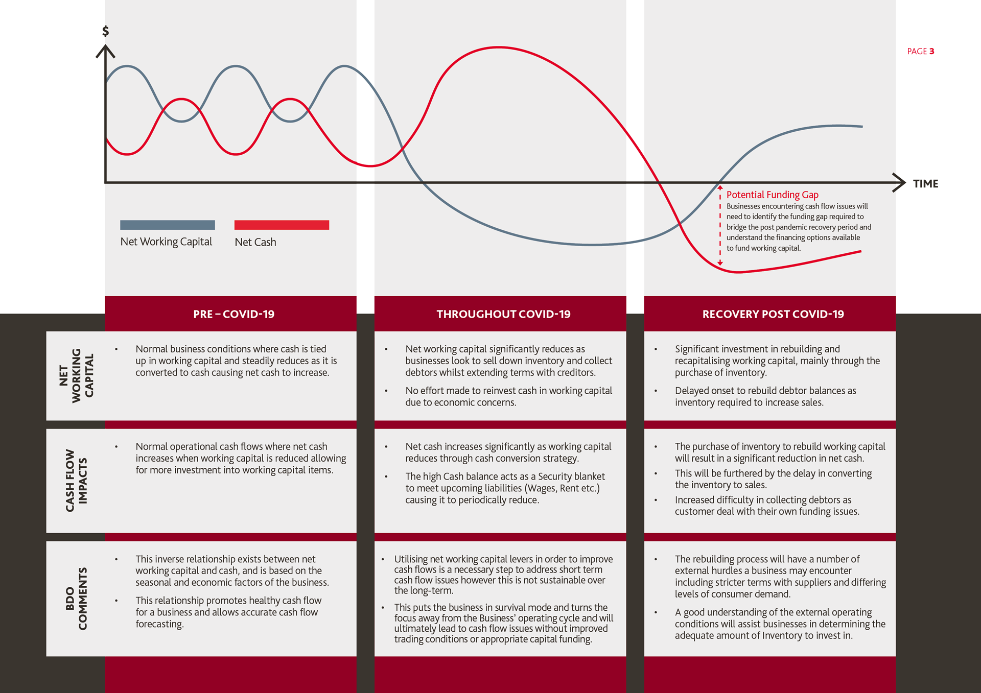 In March 2020, we started to see the effects of the COVID-19 pandemic hit the Australian economy. In response, many businesses looked to rely on preserving and building cash by utilising Government support, selling down inventory, collecting trade debtors and entering into agreements to extend terms with creditors as a way to protect themselves in a time of uncertainty. This desire to increase the amount of cash businesses held or had at their disposal has significantly impacted our mindset towards the importance of working capital. In normal business conditions, healthy businesses should be able to broadly demonstrate an inverse relationship between cash and working capital. This relationship enables the business to rely on working capital and let it form a critical foundation to cash flow forecasting.