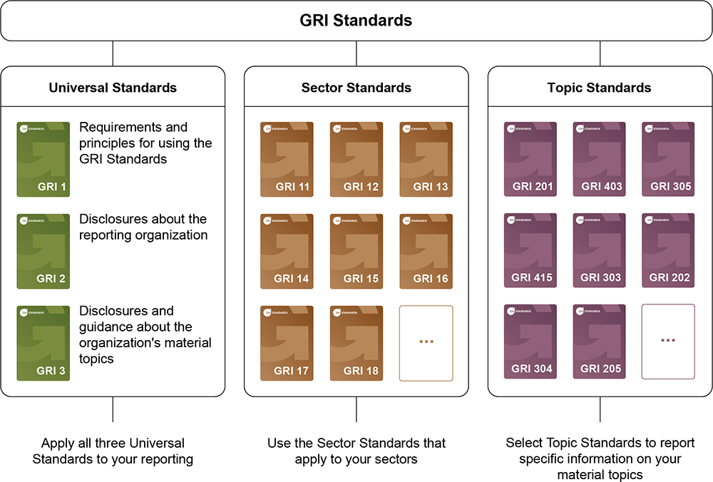 Under the GRI structure, Standards are categorised into three buckets, being: