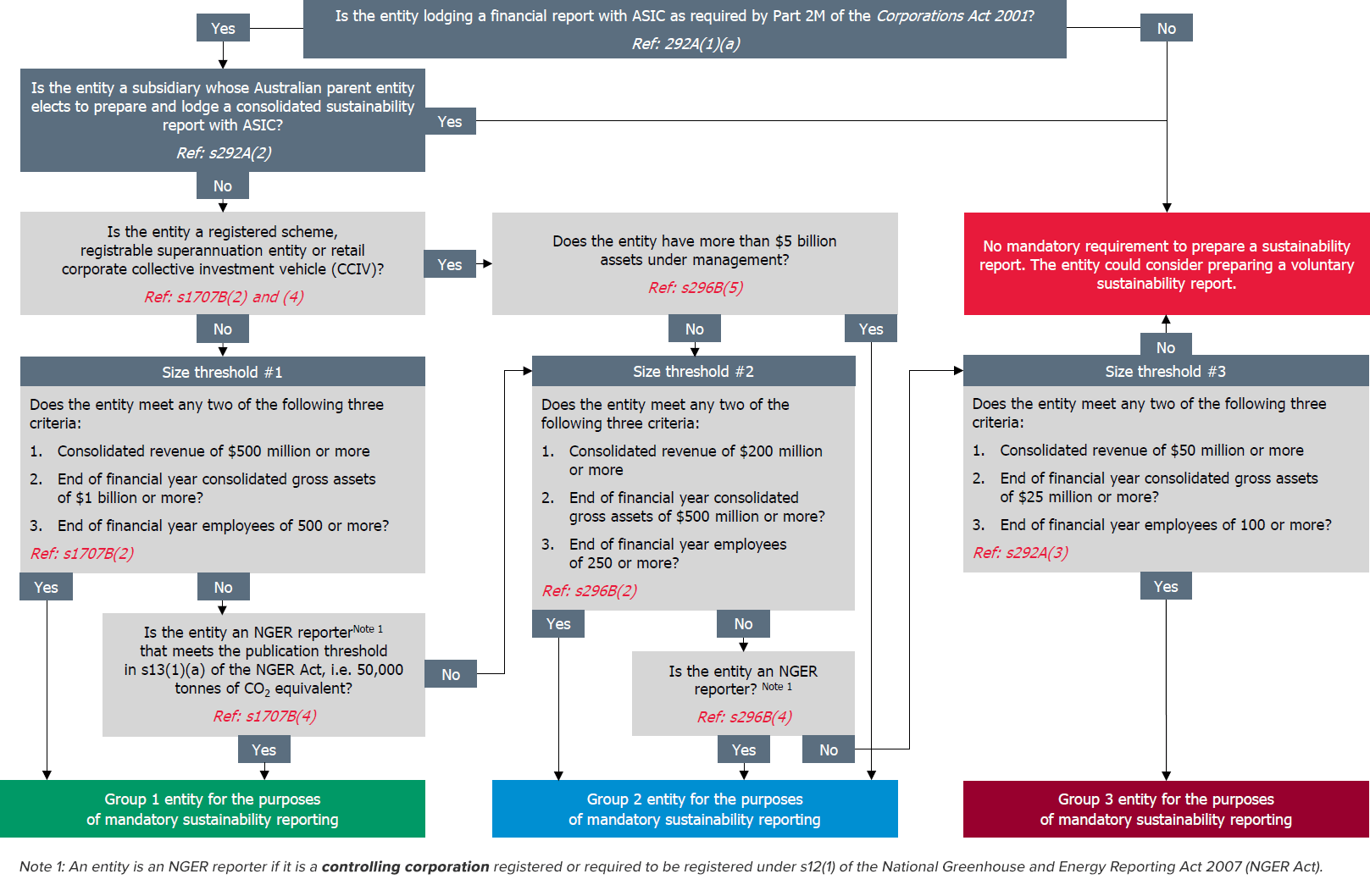 Australian entities required to prepare and lodge a financial report with the Australian Securities and Investments Commission (ASIC) under Chapter 2M of the Corporations Act 2001 must prepare a sustainability report if they meet certain criteria, as shown in the diagram below.