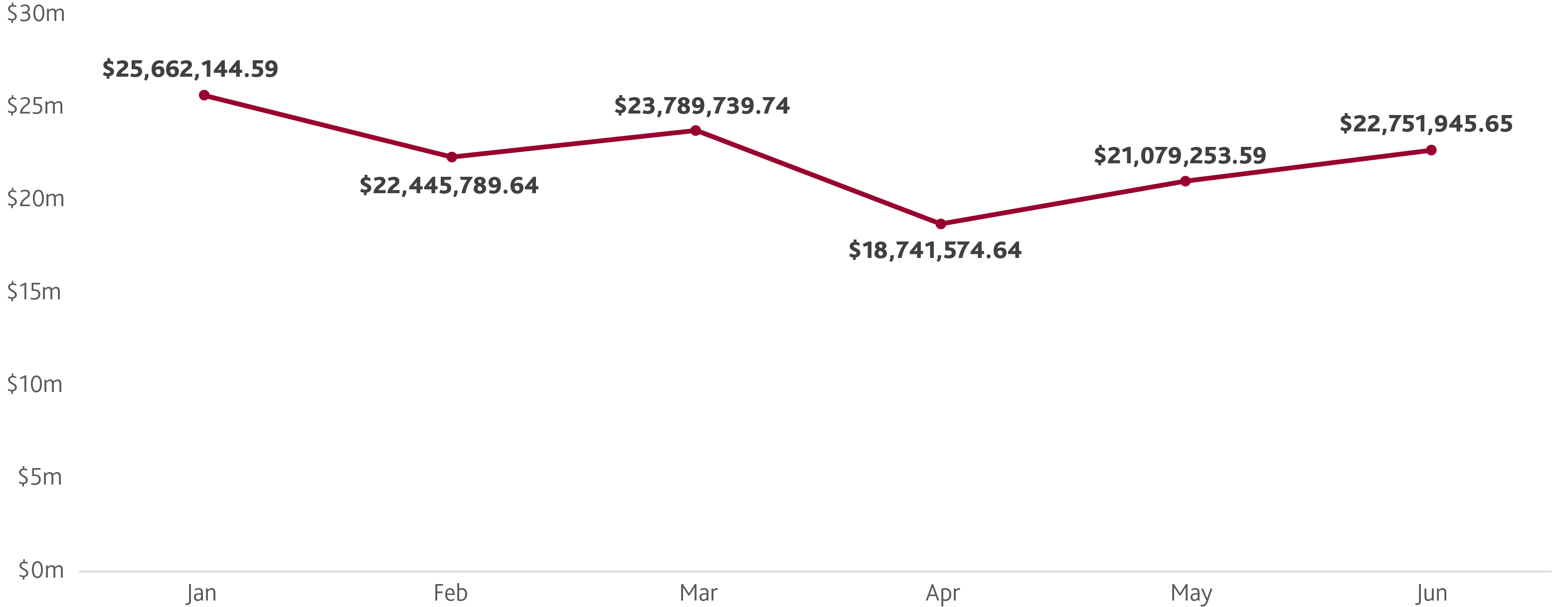 The graph below shows the cumulative Australian dollars lost to scams for the first two-quarters of 2024.