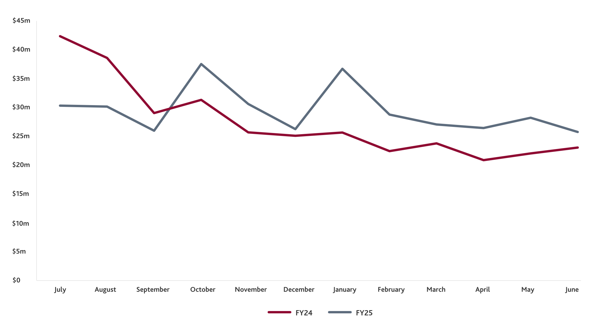 The graph below shows the cumulative Australian dollars lost to scams across FY25.