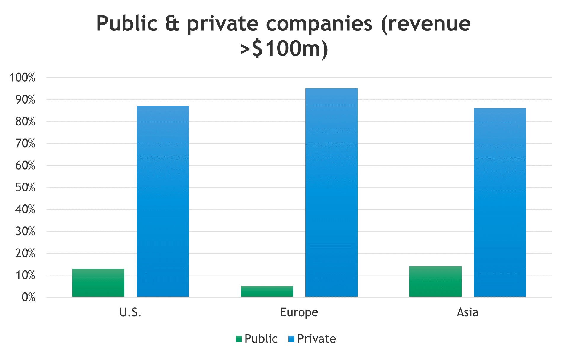 Figure 2: Number of public vs private companies in Europe, Asia and the U.S. with revenue Source: Hamilton Lane, A Guide to the Private Markets