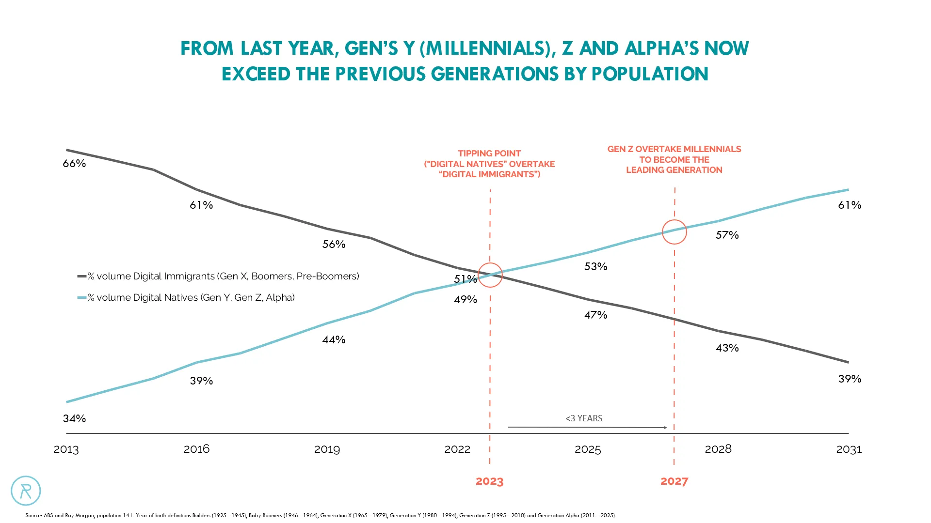 Last year, we saw digital natives overtake digital immigrants as a share of the total population, and by 2027, Gen Zs will overtake millennials to be the leading generation in Australia. This generational shift will continue over the next few years.